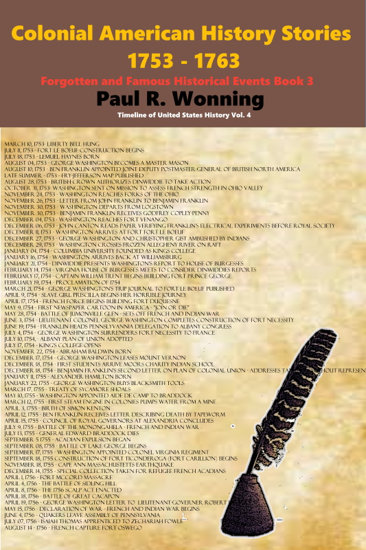Colonial American History Stories – 1753 – 1763 contains almost 300 history stories presented in a timeline that begins in 1755 with the hanging of the Liberty Bell and ends with the Treaty of Paris that ended the French and Indian War. This journal of historical events mark the beginnings of the United States and serve as a wonderful guide of American history. These reader friendly stories include: March 10, 1753- Liberty Bell Hung April 9, 1754 – Slave Girl Priscilla Begins Her Horrible Journey April 12, 1755 – Ben Franklin Receives Letter Describing Death by Tapeworm November 01, 1756 – Samuel Adams Elected Tax Collector June 28, 1762 – First Reported Counterfeiting Attempt at Boston