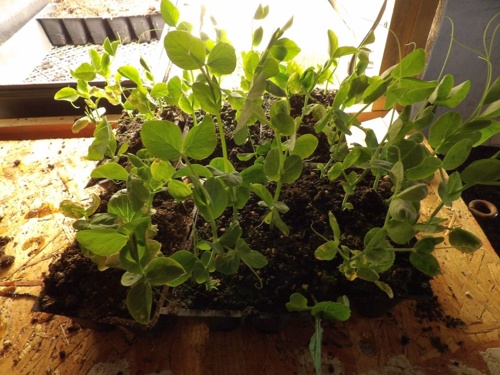 My plan originally had been to plant the snow pea and mesclun seedlings directly in a garden bed/greenhouse I am building, however the greenhouse was not yet ready, so I transplanted the peas to three-inch pots and set them in the hotbed.